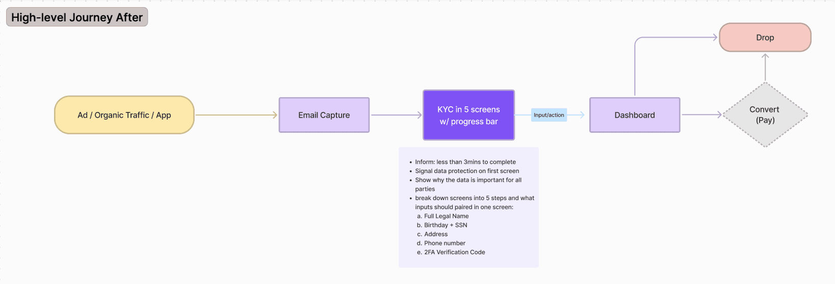 Created a new onboarding journey map covering pre-sign-up education → KYC verification → first payment setup.